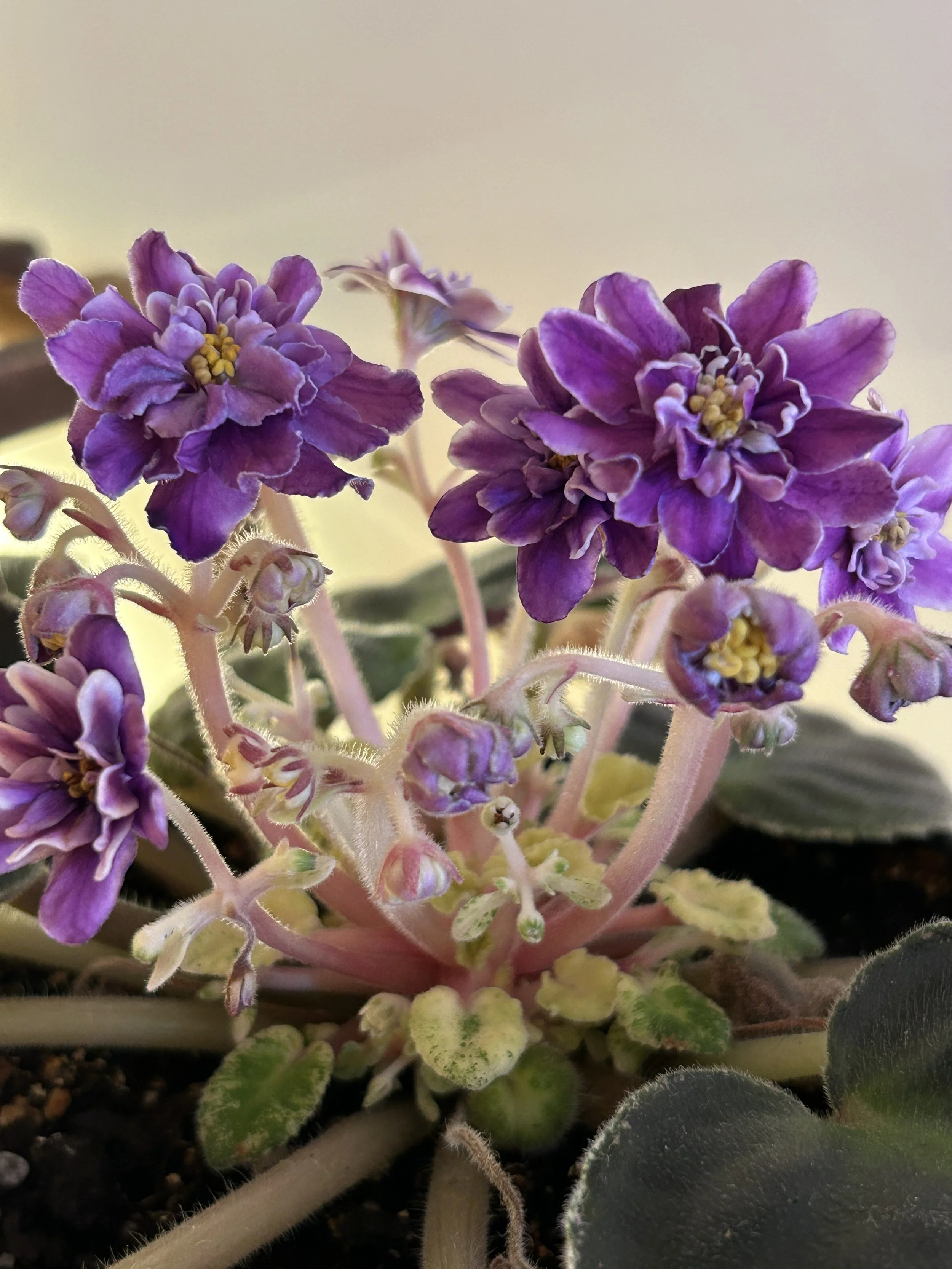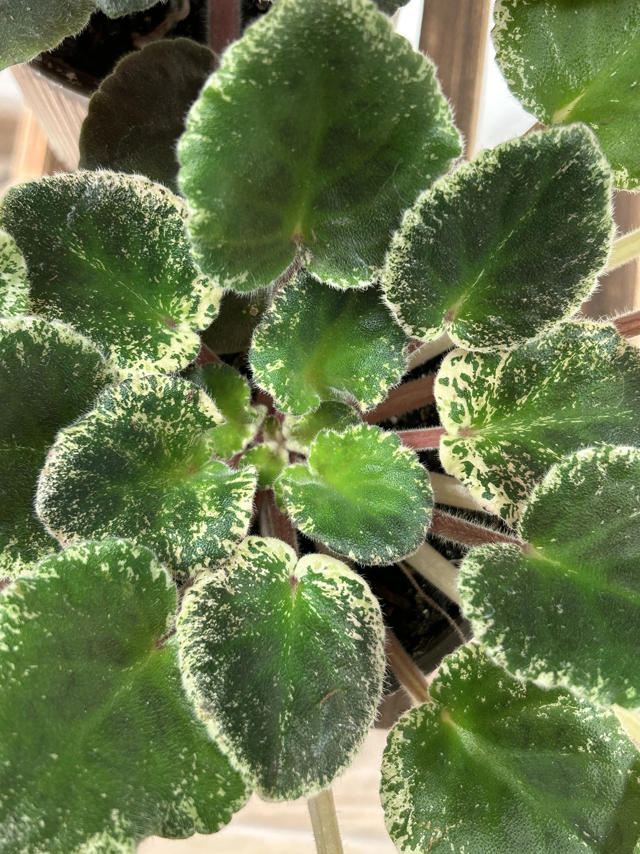 They do very well on shaded windowsills, or set just a little back, on the counter where the light can reach. Grow lights are a no-go for their sensitive leaves. You’ll know if your violet is getting too much light because the leaves growing from the crown will start to get tiny and bleached. Not enough light and the leaves will start reaching and stretching.