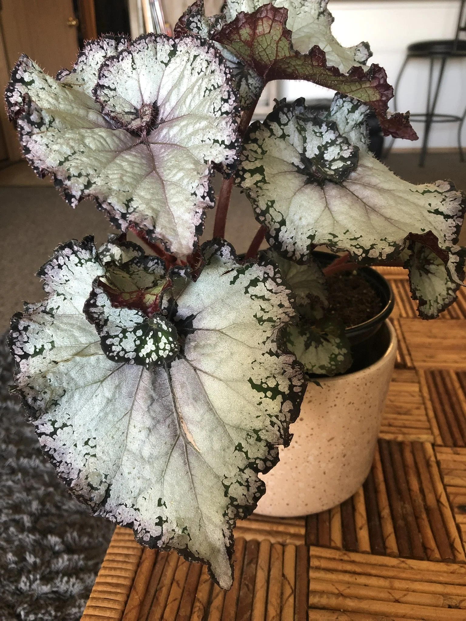 Rex begonias are technically rhizomatous but are sometimes separated into their own 5th classification. This is because their leaves are more thin/delicate, they’re more prone to rot, and they are less forgiving to lower humidity than other rhizomatous varieties.