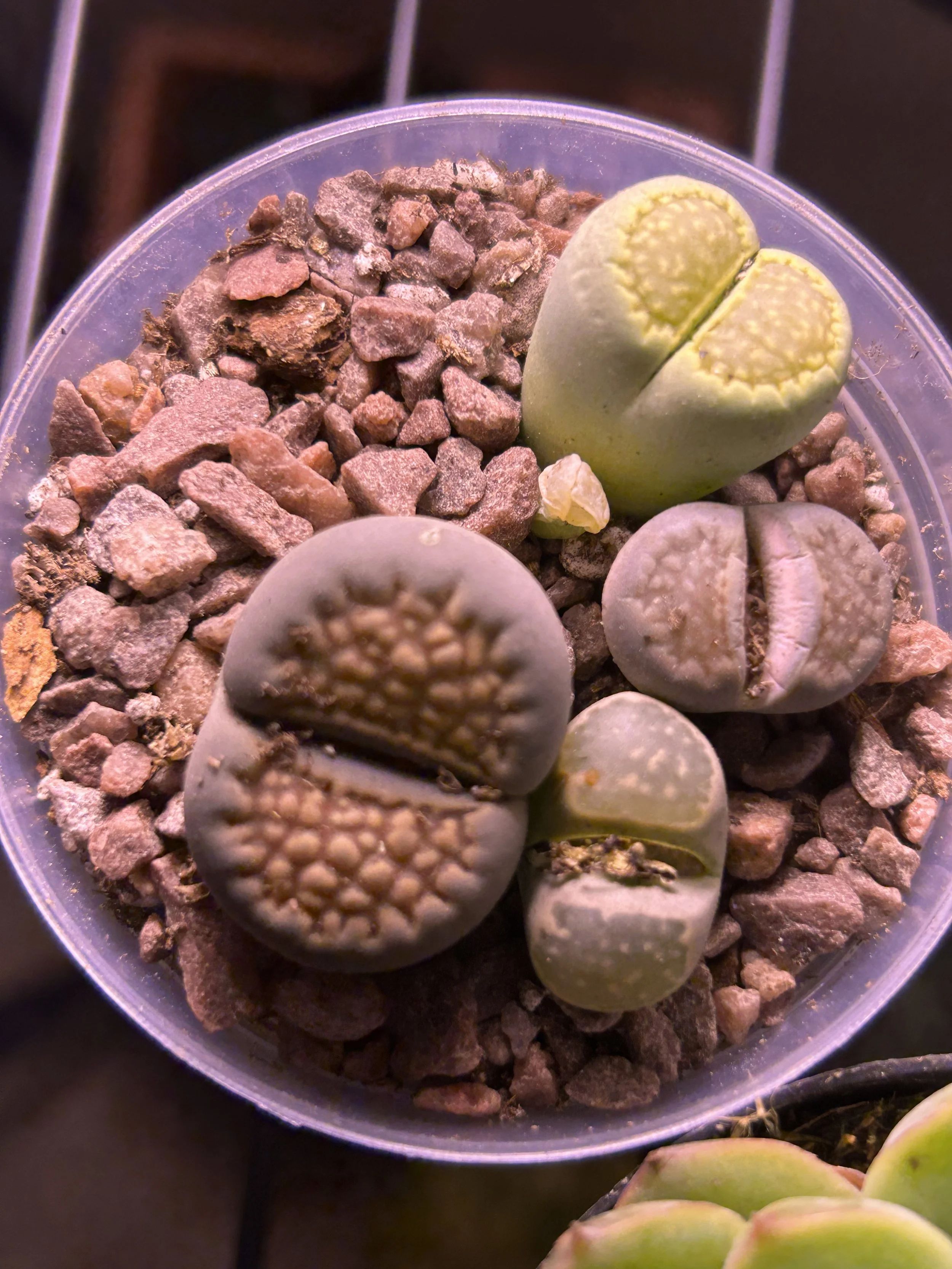 Lithops are exciting little plants, surprisingly easy to take care of. As long as you have enough light and the right substrate, they thrive when left alone. They grow in the remote deserts of South Africa, blending in with surrounding rocks.