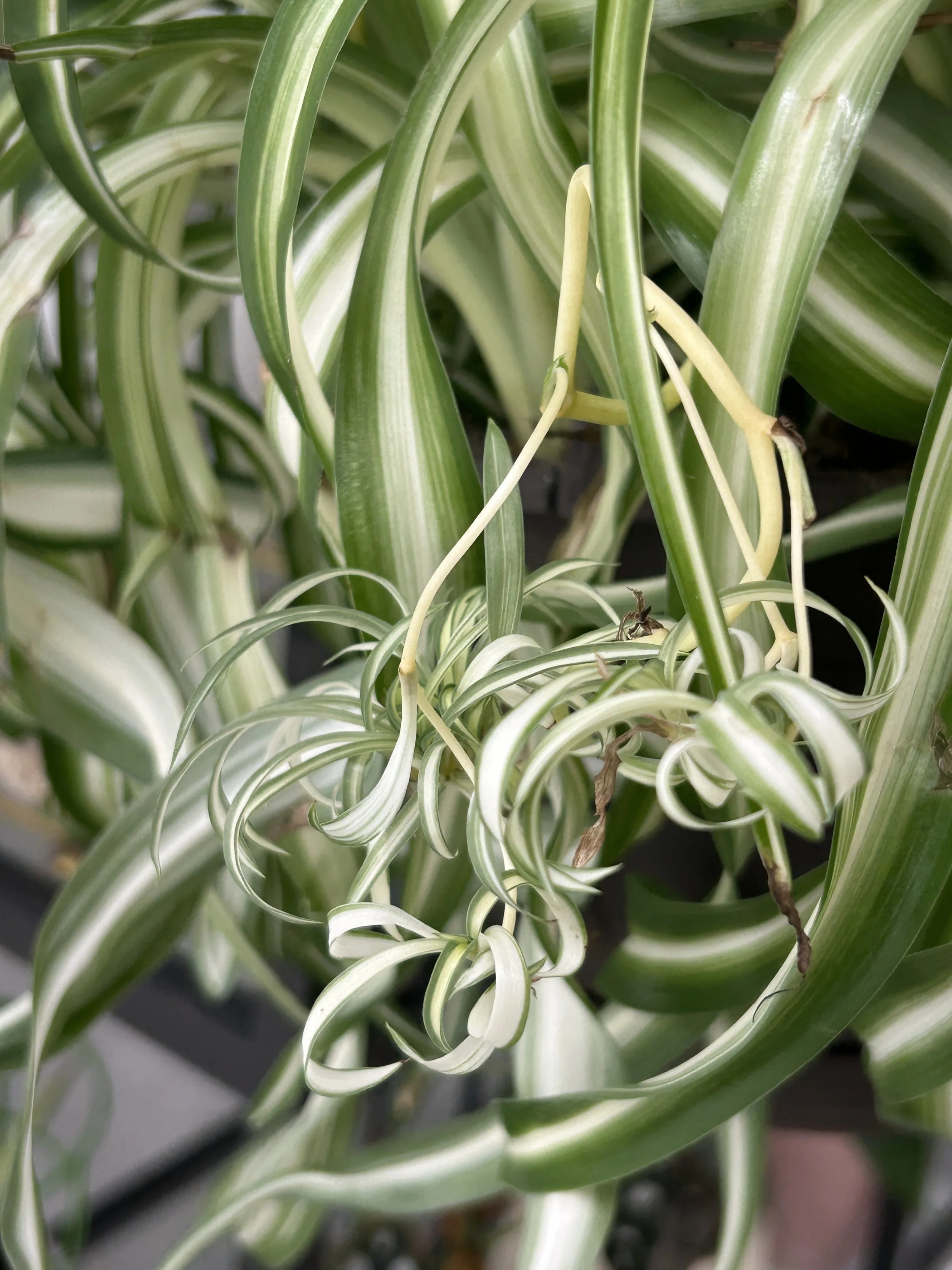 Spider plants come in several different color patterns. Some have white and green stripes while others are solid green. Some have curly leaves. When growing conditions are ideal, they produce long stalks with flowers and plantlets.