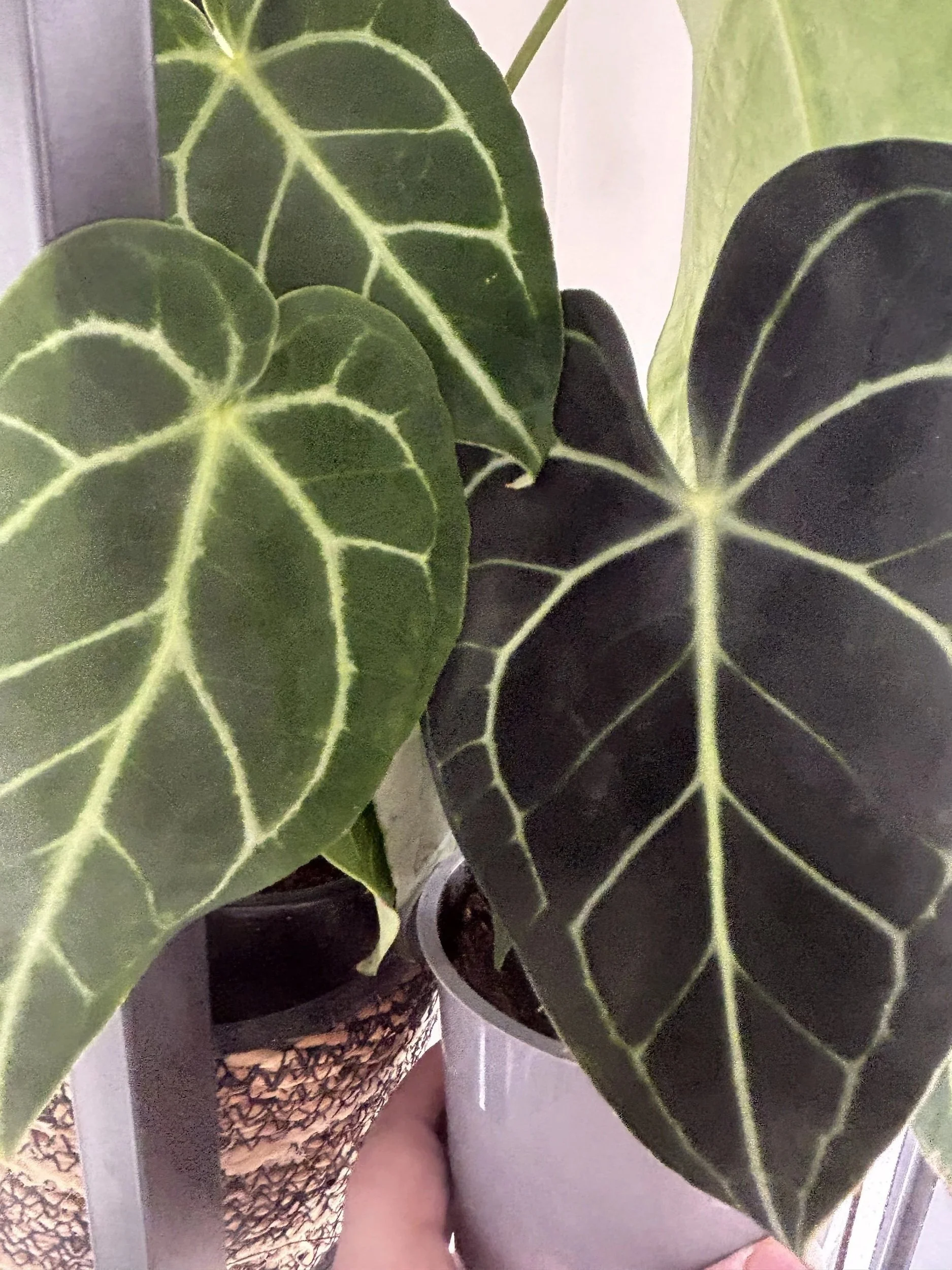 Anthuriums are a cousin of the Alocasia—also aroids—with over 1,000 species, making them the largest genus of the arum family. Some possess striking, ornamental leaves with modest flowers, while others have bright, showy, colored flowers with modest leaves. Like their alocasia cousins, some anthuriums’ leaves are rubbery, while others have a velvety texture. Each one requires slightly different care.
